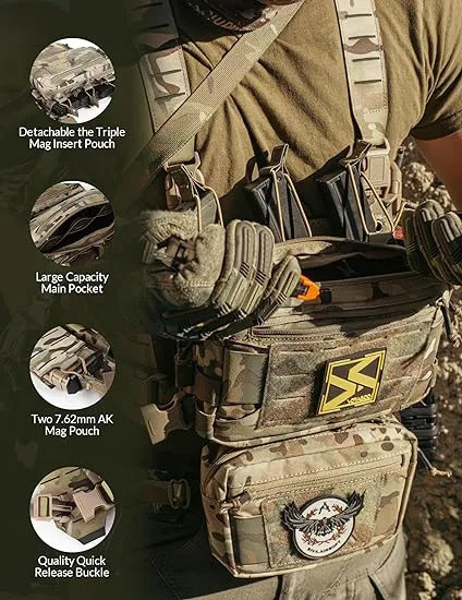 Multifunctional Pockets: Chest rigs tactical main chassis fit 3 5.56mm Magazine on two 7.62mm AK Magazines. The triple mag insert is made using elastic, giving you quick and easy access to your mag while maintaining excellent retention. Laser-cut MOLLE straps on big main bag and shoulders for equipping more Tactical Gears make it a stand-alone system with maximum equipment storage. A detachable bottom pouch for other tools like, medical bag.