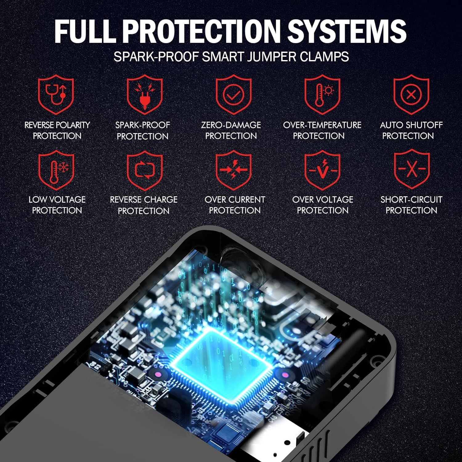 provides versatile protection systems including low/high voltage, over-temperature, short-circuit, reverse polarity and jump starter time out protection, without the worry of