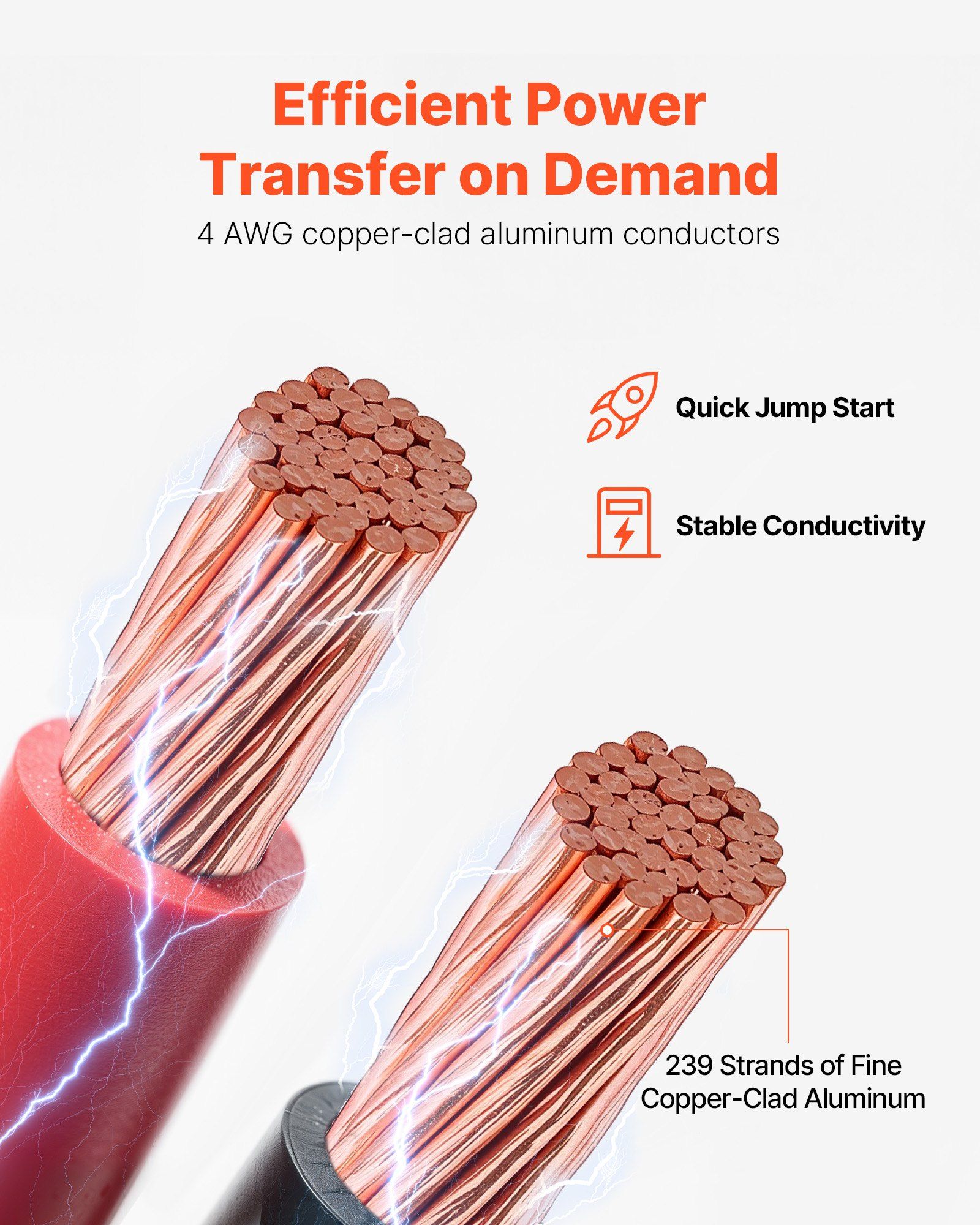*These 4 AWG booster cables deliver 445N riveting tensile strength for a secure battery connection and power transfer. Built with 239 strands of copper-clad aluminum, it supports up to 235A peak current. The PVC jacket stays flexible, while the color-coded cables and carrying bag make operation easy.