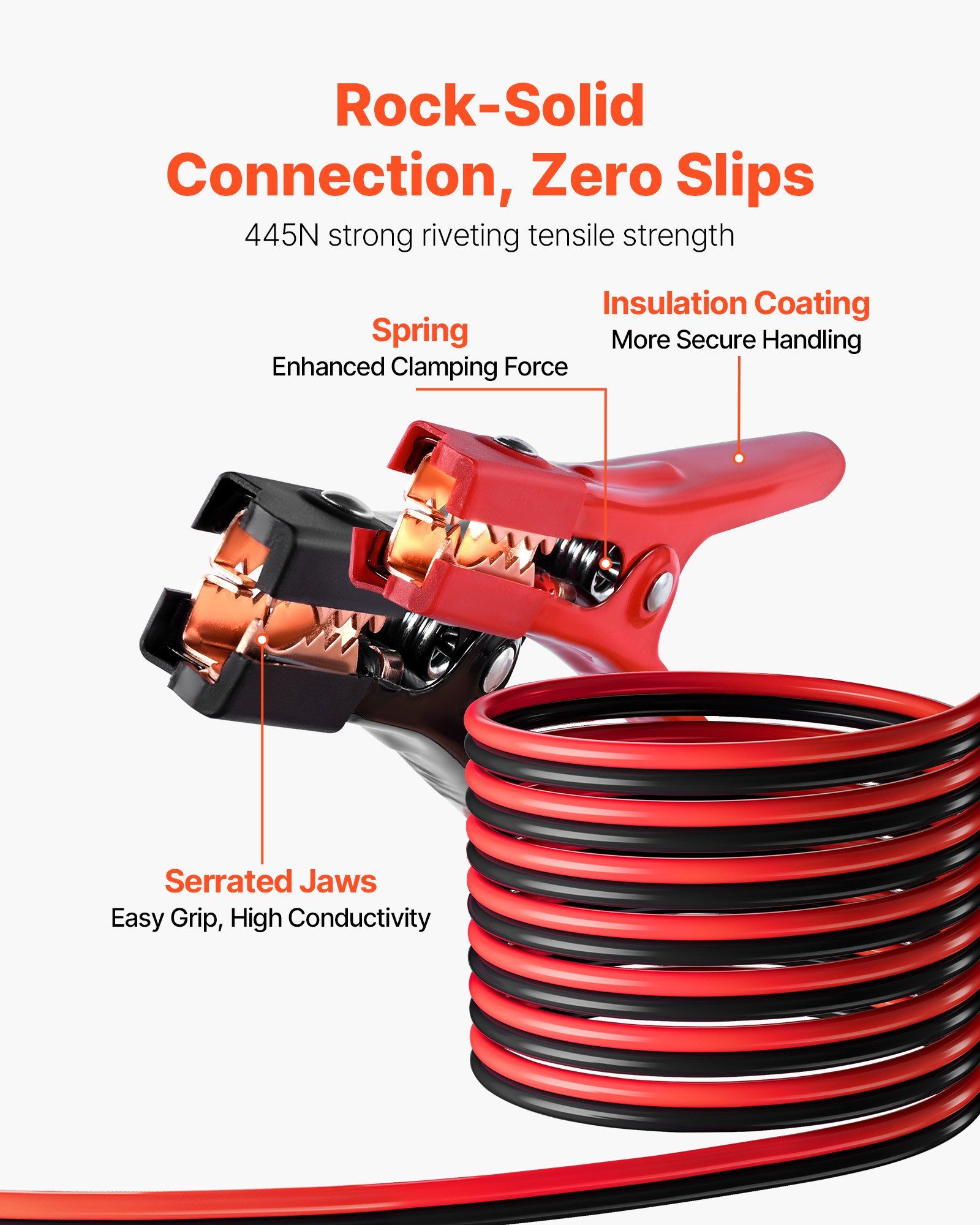 1) Strong & Stable Connection: Built with 4 AWG copper-clad aluminum wires and tough alligator clamps, these jumper cables for car battery connect securely. With 445N riveting tensile strength, they stay in place. Jump-start quickly in emergencies
