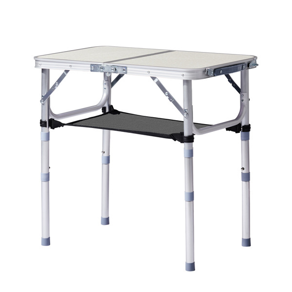 Enjoy convenience and versatility anywhere with this Folding Camping Table. Designed with 3 adjustable height settings, this portable aluminum table adapts to your needs—whether as a low coffee table, a standard patio side table, or a taller utility table. Its foldable design with a built-in carry handle makes it easy to transport for camping, picnics, beach trips, BBQs, and more. A durable aluminum frame ensures long-lasting performance while staying lightweight, and the mesh net shelf underneath adds handy storage for keeping essentials close by.