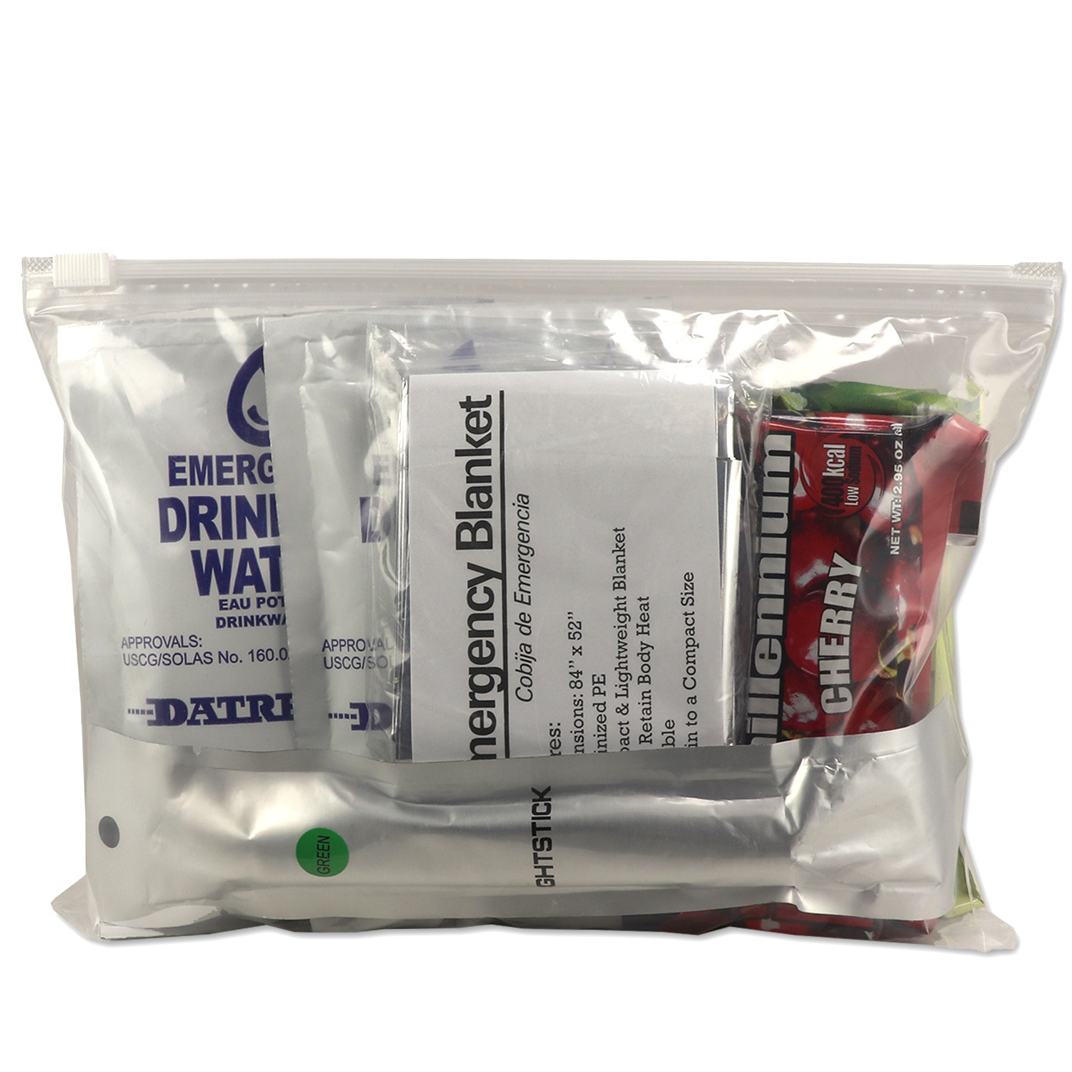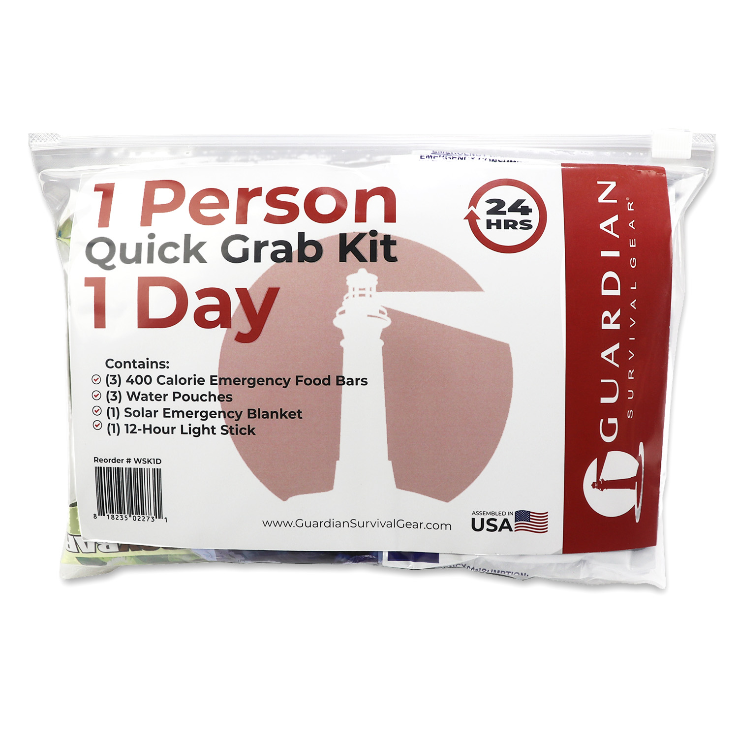 Be ready for any emergency with the 1 Day Quick Grab Kit. This lightweight, compact kit is packed with essential survival items for one person, all conveniently stored in a resealable bag for easy access and portability. Contents Include: (1) Mylar Blanket: Compact thermal blanket designed to retain body heat and provide warmth. Highly reflective and can be used as a signaling device for rescue workers. (3) 400 Calorie Food Bar: Long-lasting emergency food ration with vital nutrients to sustain energy. Each kit contains a blueberry, cherry and vanilla bar. (3) Water Pouches (4.2 oz each): Securely sealed, clean drinking water for hydration on the go. Each pouch contains 4.2oz of purified water for long term storage. (1) 12-Hour Bright Stick: Reliable, long-lasting light source for visibility and safety in dark conditions. Ideal for home, car, or workplace preparedness, the 1 Day Quick Grab Kit ensures peace of mind in any situation. Whether evacuating, dealing with civil unrest, or hunkering down during a natural disaster, the 1 Day Quick Grab Kit has the essentials needed for preparedness.  Also available in a 3 day variant.   Emergency Survival Kit Information: This kit was designed using advice from experts in the field of emergency preparedness. It follows guidelines offered by government agencies, ready.gov and nonprofit preparedness organizations.
