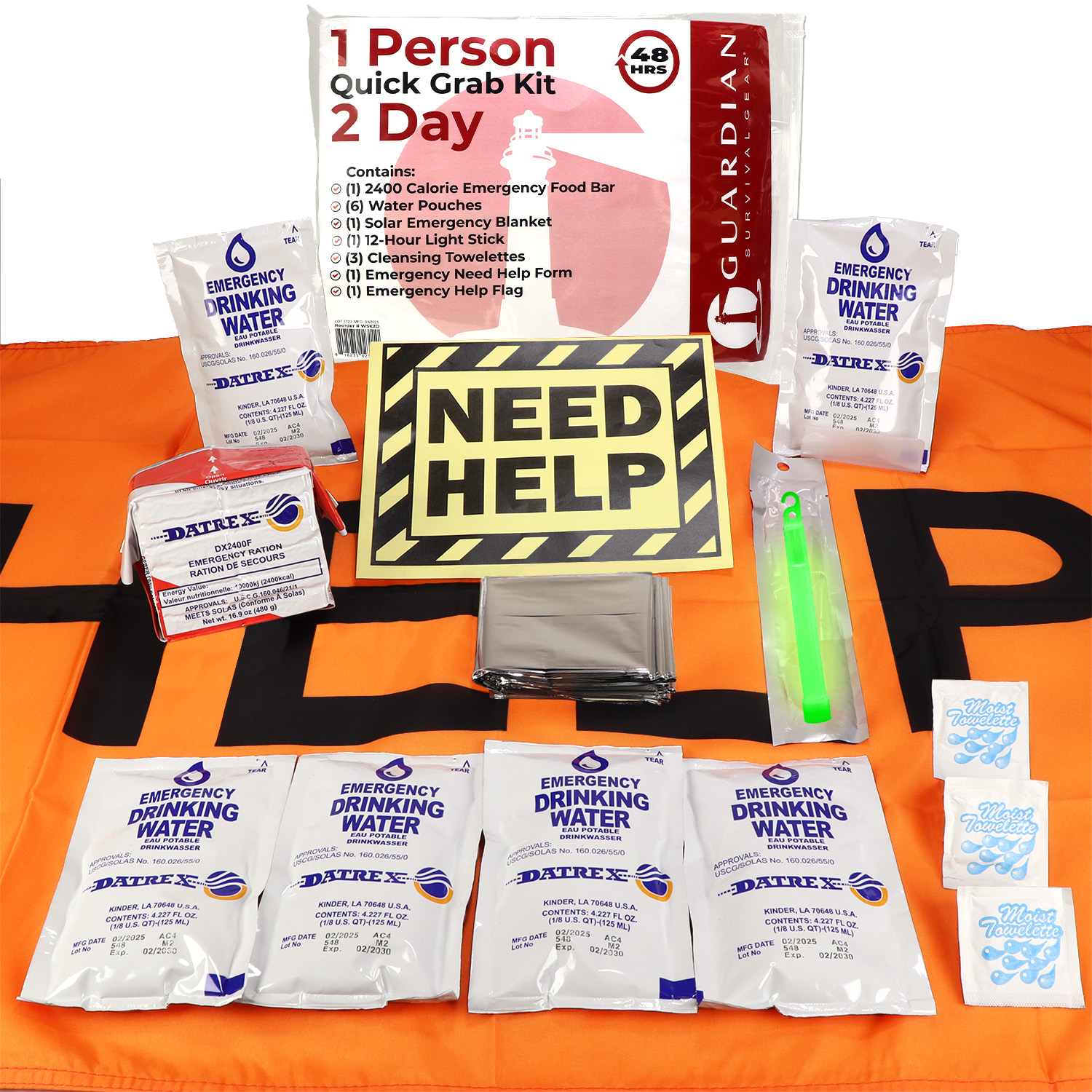 Be ready for any emergency with the 2 Day Quick Grab Kit. This lightweight, compact kit is packed with essential survival items for one person, all conveniently stored in a resealable bag for easy access and portability. Contents Include: 3 Cleansing Towelettes: Maintain hygiene and freshness in challenging conditions. 1 Mylar Blanket: Compact thermal blanket designed to retain body heat and provide warmth. 1 2400kcal Food Bar: Long-lasting emergency food ration with vital nutrients to sustain energy. 1 High Visibility Help Flag: Bright orange help flag with grommets and measuring 24"x36" allows you to signal for assistance no matter where you are. 6 Water Pouches (4.2 oz each): Securely sealed, clean drinking water for hydration on the go. 1 12-Hour Bright Stick: Reliable, long-lasting light source for visibility and safety in dark conditions. Ideal for home, car, or workplace preparedness, the 2-Day Quick Grab Kit ensures peace of mind in any situation. Whether evacuating, dealing with civil unrest, or hunkering down during a natural disaster. The 2 Day Quick Grab Kit has the essentials needed for preparedness. Also available in a 3 day variant. Emergency Survival Kit Information: This kit was designed using advice from experts in the field of emergency preparedness. It follows guidelines offered by government agencies, ready.gov and nonprofit preparedness organizations.