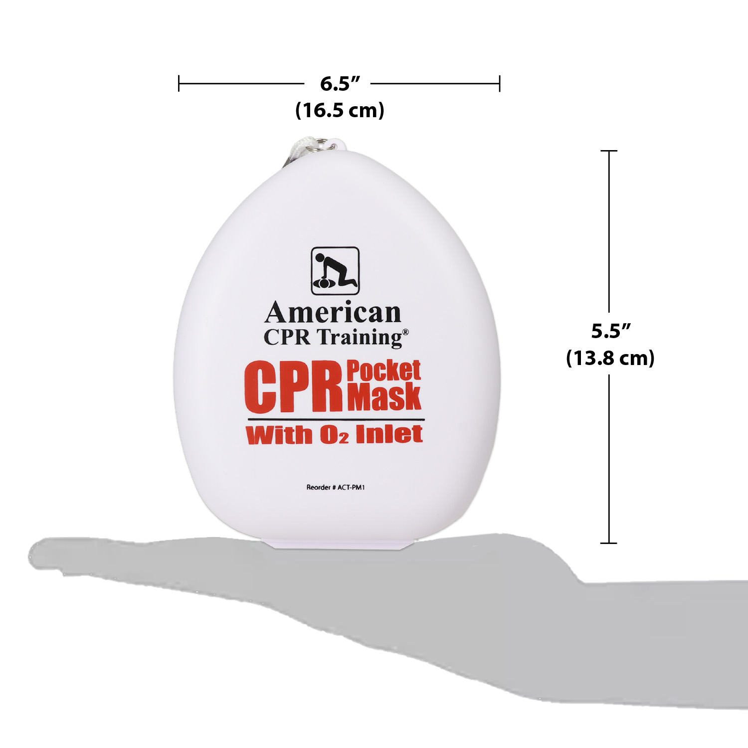 American CPR Pocket Mask, Plastic Case, Adult/Child/Infant with O2 Inlet The American CPR Training CPR Mask is especially designed to offer superior protection for both rescuer and victim by combining a low resistance one-way valve with a disposable hydrophobic filter to help prevent the passage of liquids and secretions. The oxygen inlet facilitates delivery of supplemental oxygen during ventilation of a non-breathing patient or for inhalation by a spontaneously breathing patient. The pre-inflated cuff is made from super soft plastic providing superior seal. Superior protection through a one-way valve and filter. Pre-inflated cuff for effective and tight seal. Includes: Hard Shell with Wrist Strap Transparent Mask Disposable One-Way Valve and Filter O2 Inlet with Cover Elastic Head Strap Pair of Exam Gloves Two Alcohol Prep Pads Directions for Use *Made from 100% latex free material. NOTE! This mask works on all ages, while for Adults and Children, the narrow or pointed end fits over the bridge of the nose, for Infants, the mask is inverted, with the narrow or pointed end at the chin, covering the face. Case Dimensions: 5.5" x 4.87" x 1.75"