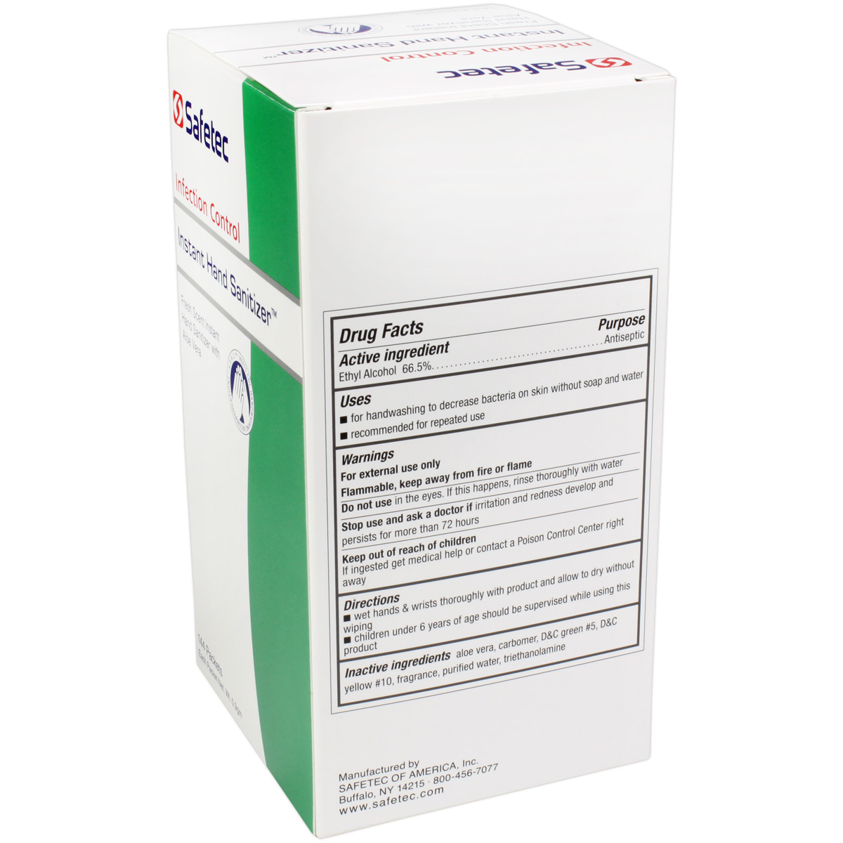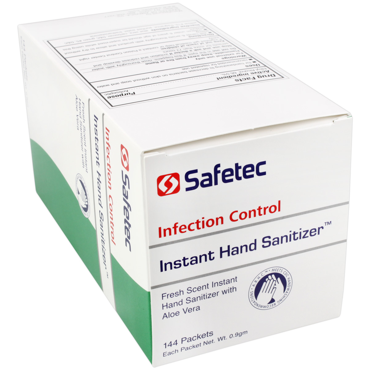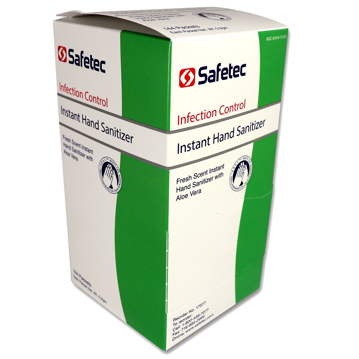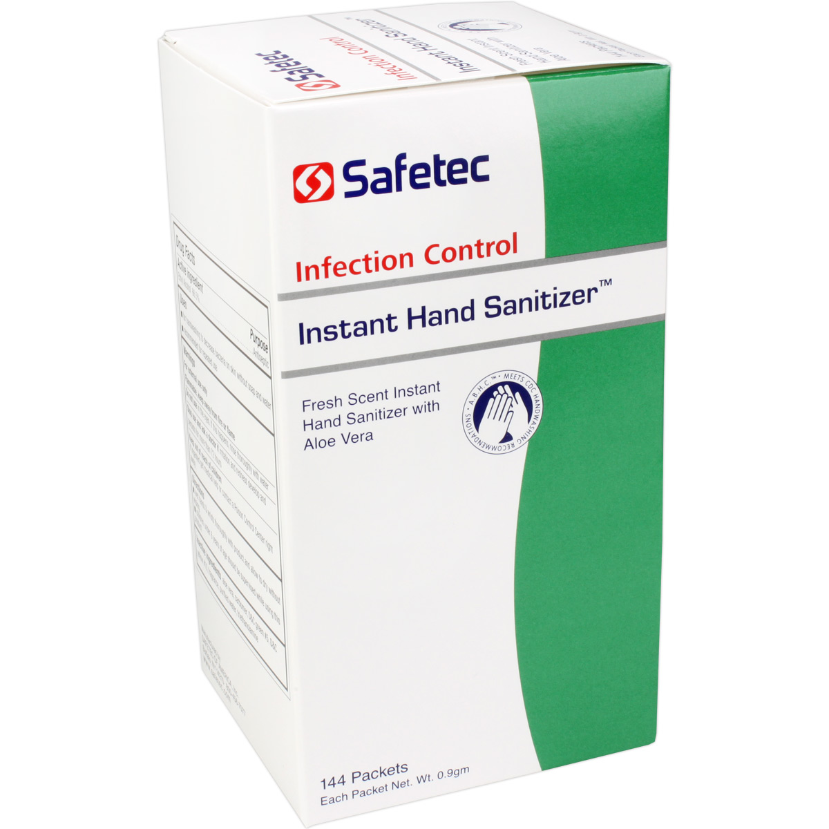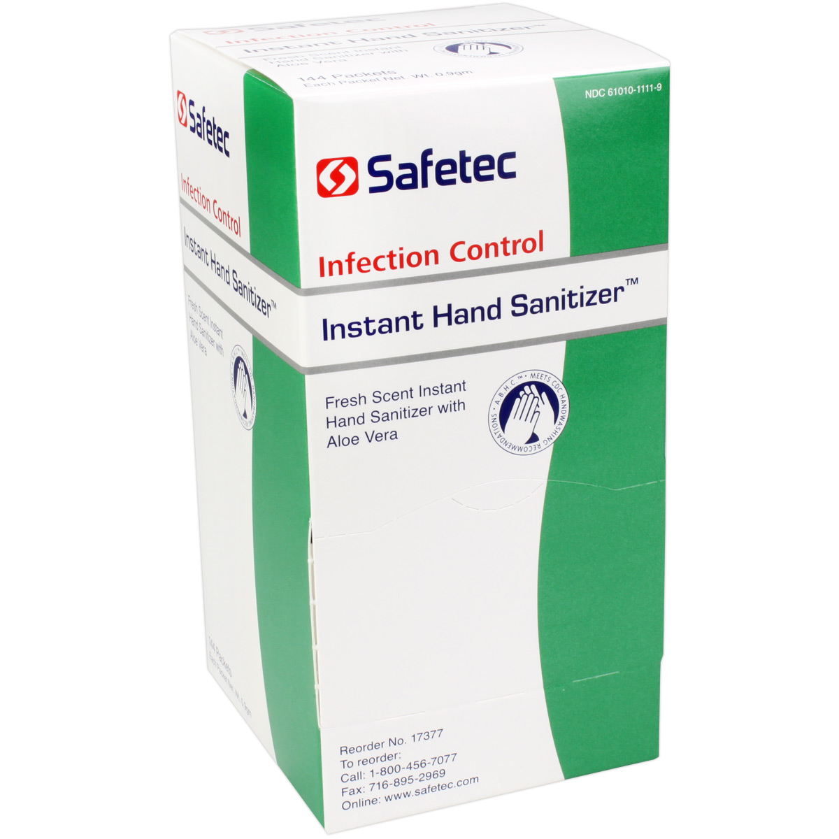 Safetec Instant Hand Sanitizer (Fresh Scent) kills 99.9% of widespread germs and evaporates completely to leave hands not feeling sticky. It contains aloe vera for added moisture with each use, increases skin hydration and preserves skin’s health. Convenient Hand sanitizer packets. Safetec Instant Hand Sanitizer is formulated with an  enriched moisturizing agent to condition and preserve  skin’s health, while preventing the spread of germ causing  illnesses and infections. Containing 66.5% ethyl alcohol and is  scented with a pleasant fresh  fragrance.    Pandemic and Infection Control Product  Aids in reducing the risk of cross-contamination  Meets OSHA, APIC and CDC hand washing recommendations in the absence of soap and water 9gm. Pouch (144 ct. Box) (17377) Pouch: 1.25" x 2.48" / Box: 3.25" x 3.5" x 6.38"NDC 61010-1112-2 Read more about this Fresh Scent 0.9gm pouch Instant Hand Sanitizer in our informational pdf download sheet