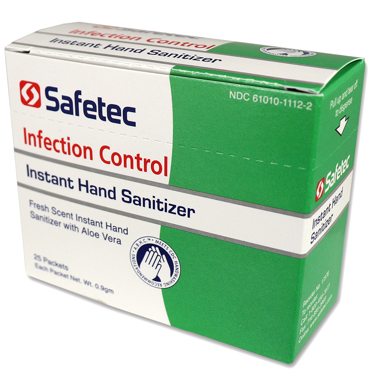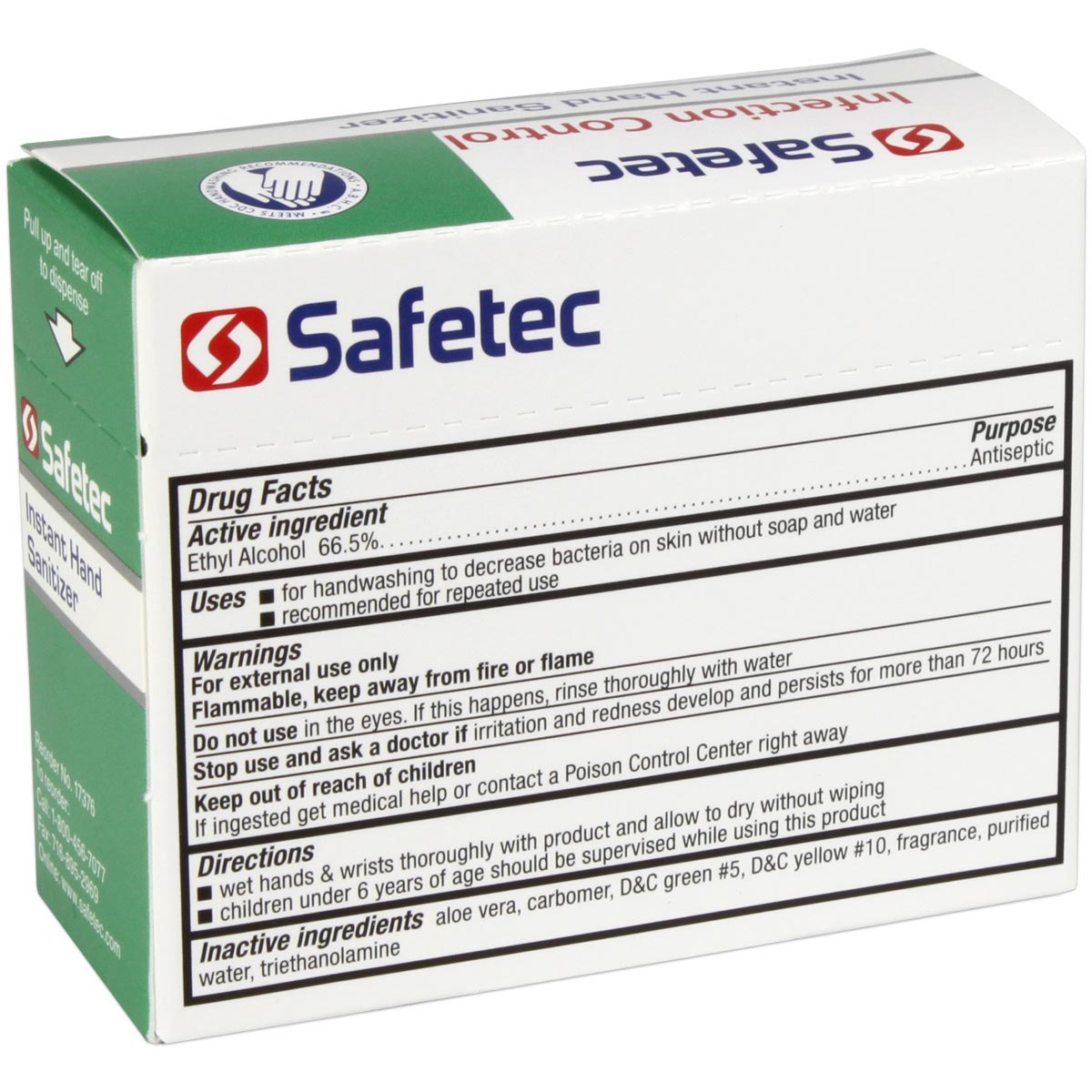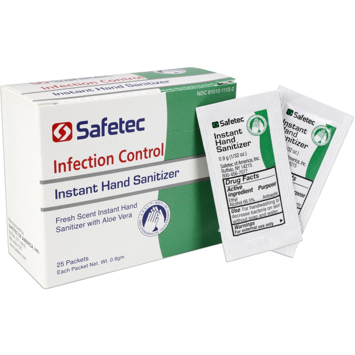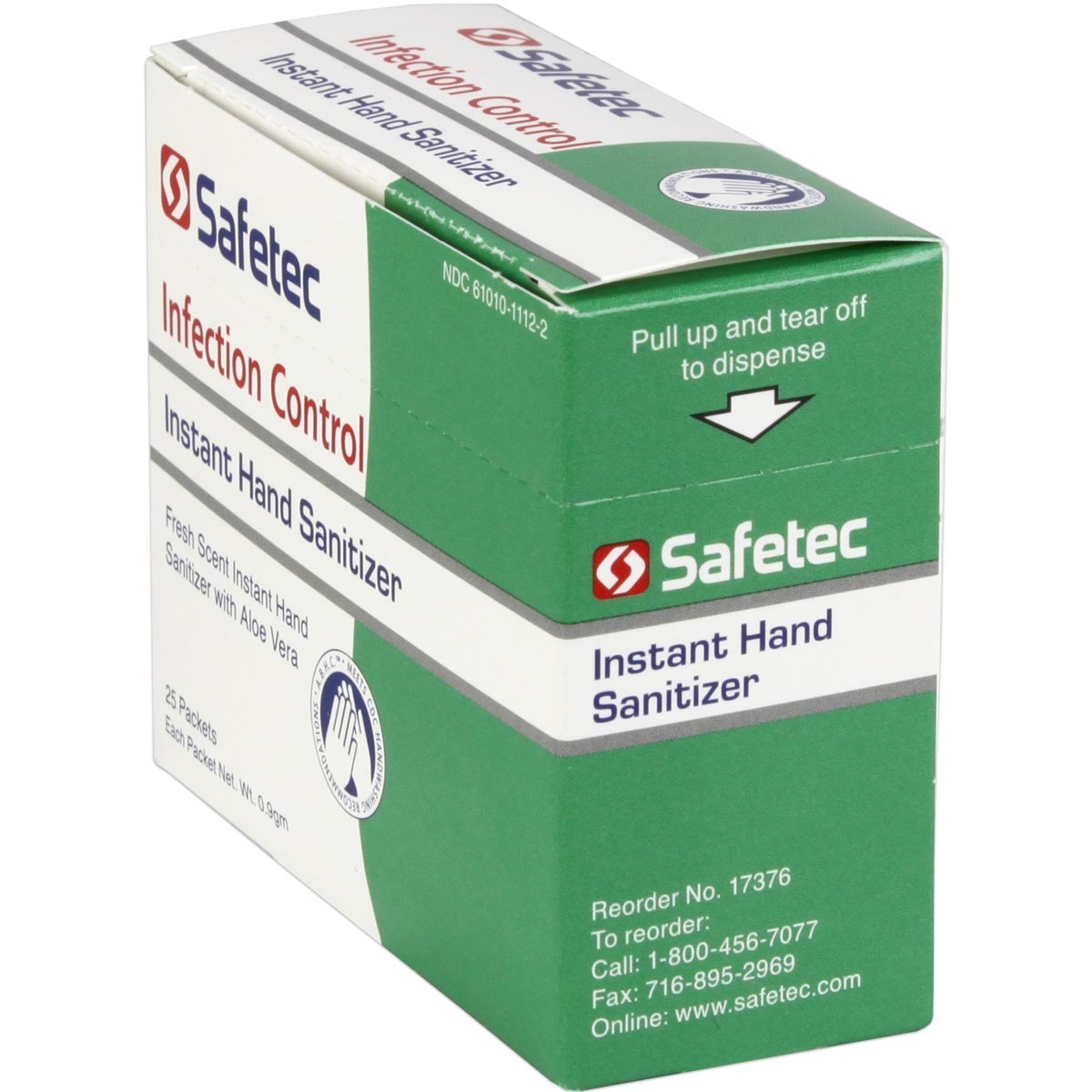 Safetec Instant Hand Sanitizer (Fresh Scent) kills 99.9% of widespread germs and evaporates completely to leave hands not feeling sticky. It contains aloe vera for added moisture with each use, increases skin hydration and preserves skin’s health. Convenient Hand sanitizer packets. Safetec Instant Hand Sanitizer is formulated with an enriched moisturizing agent to condition and preserve skin’s health, while preventing the spread of germ causing illnesses and infections. Containing 66.5% ethyl alcohol and is scented with a pleasant fresh fragrance. Pandemic and Infection Control Product Aids in reducing the risk of cross-contamination Available in convenient pump dispensers, single use pouches and flip top dispenser bottles Meets OSHA, APIC and CDC hand washing recommendations in the absence of soap and water 0.9 gm. Pouch (25 ct. Box) (17376)  Read more about this Fresh Scent 0.9g pouch Instant Hand Sanitizer in our informational pdf download sheet.