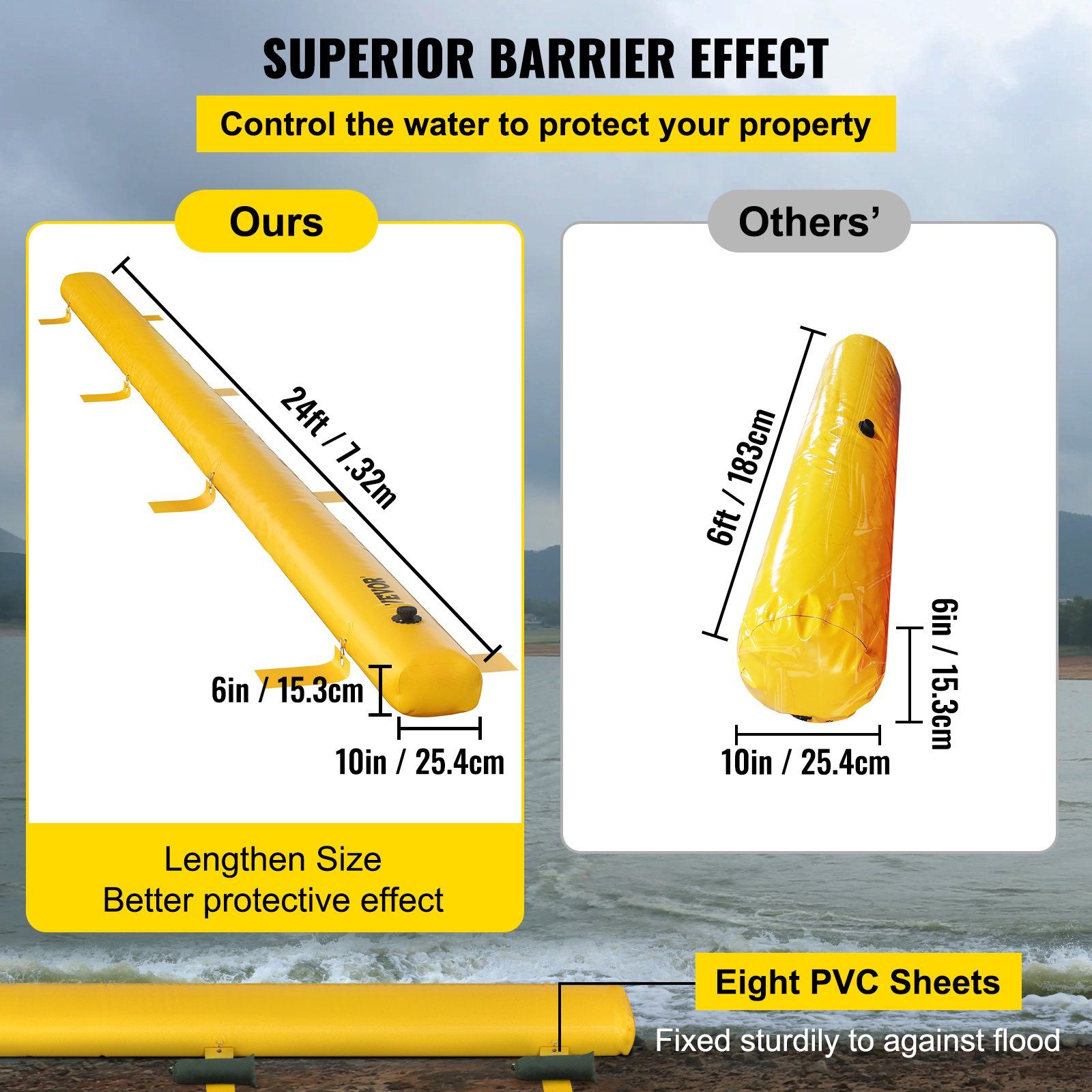1.Superior Barrier Effect: 24ft length x 10in width x 6in height, holds up to 76.6 gallons weighing 662lbs when filled with water. We designed a fixed mechanism to stop the flood barriers from moving in larger water currents.